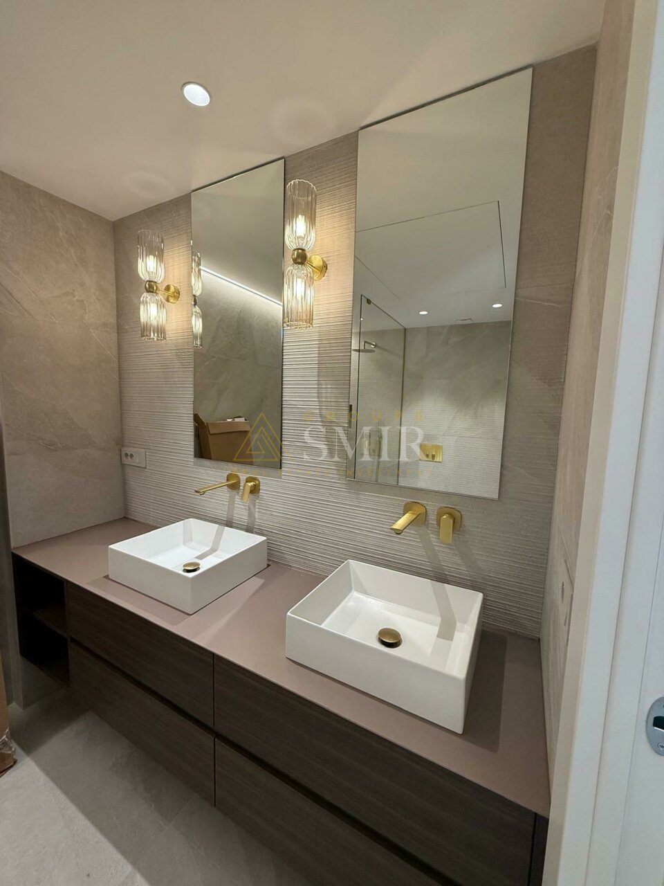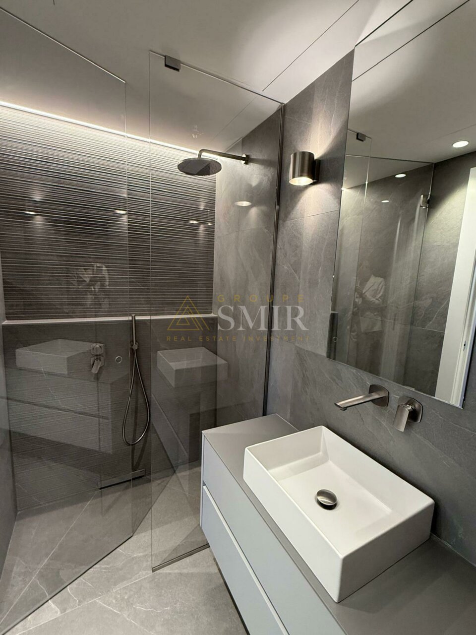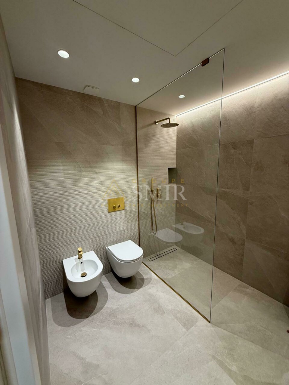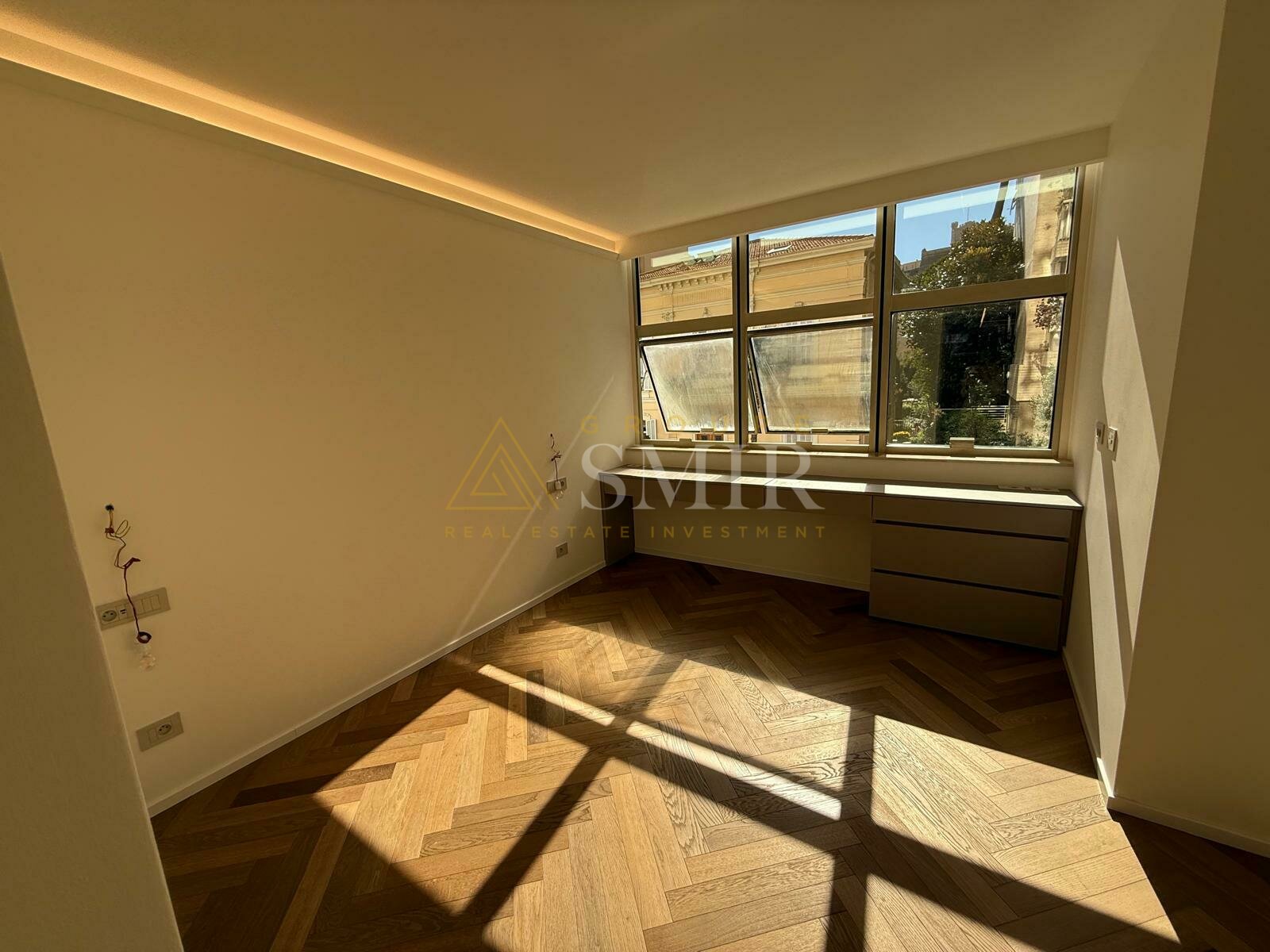 The apartment consists of an entrance hall, a spacious and very bright living/dining room with herringbone parquet flooring and recessed LED lighting, with direct access to a loggia.