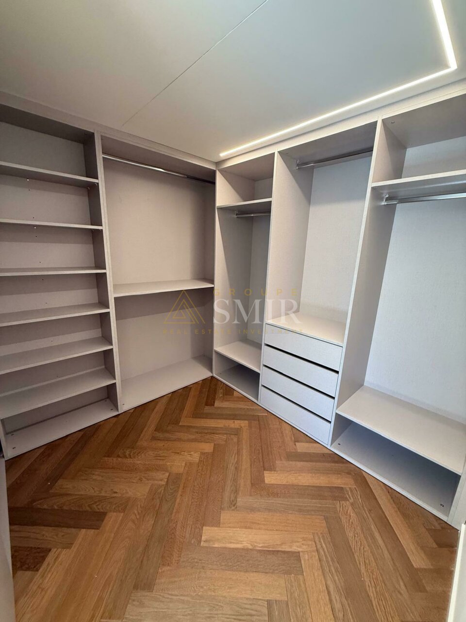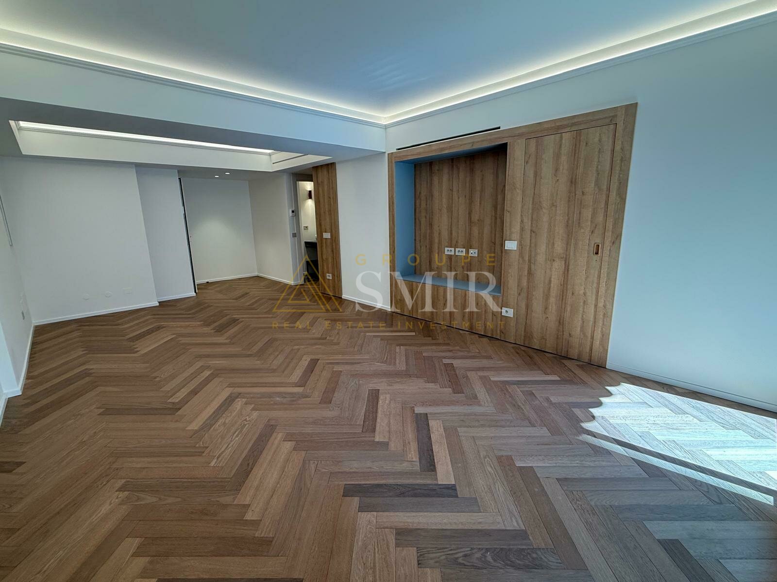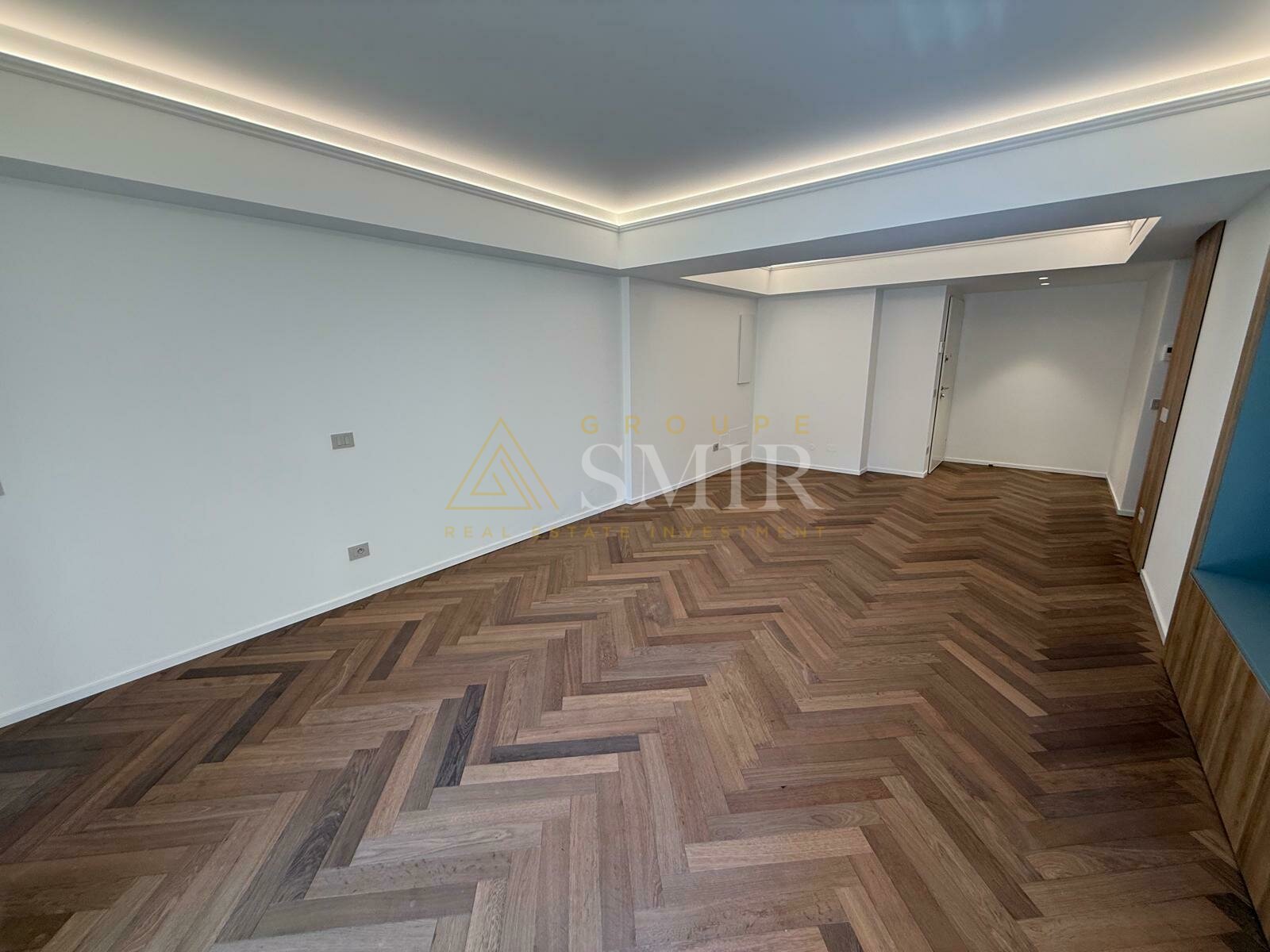 Квартира состоит из прихожей, просторной и очень светлой гостиной/столовой с паркетом елочкой и встроенным светодиодным освещением, с прямым выходом на лоджию.